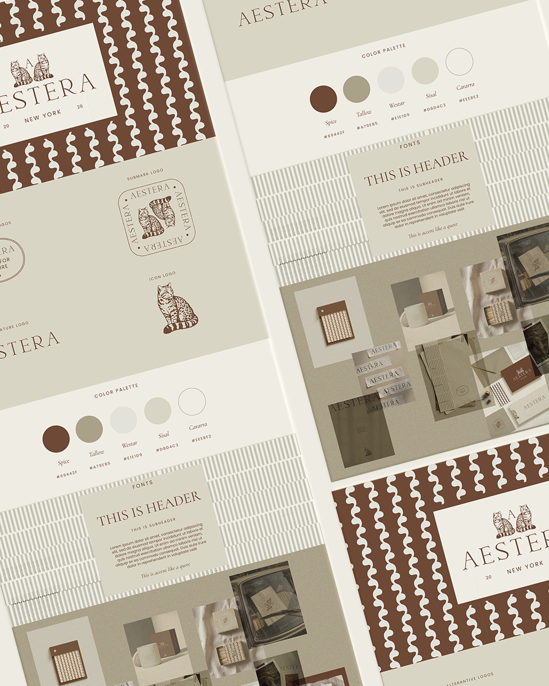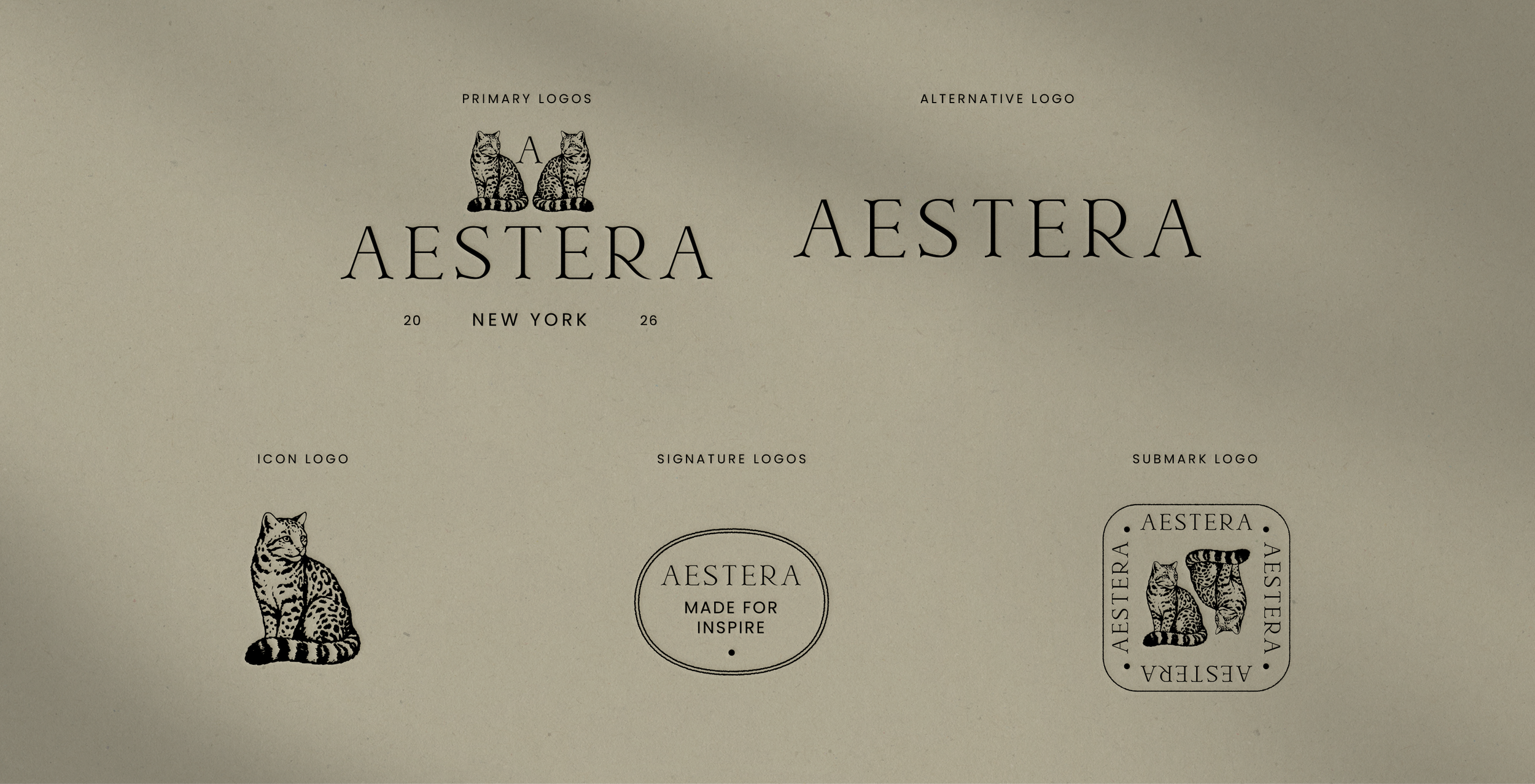 Every element has been designed to feel intentional and enduring, from the structured logos and seals to the patterns and packaging applications. Aestera’s aesthetic translates seamlessly across stationery, packaging, editorial layouts, and digital platforms, always maintaining a cohesive, elegant presence.
