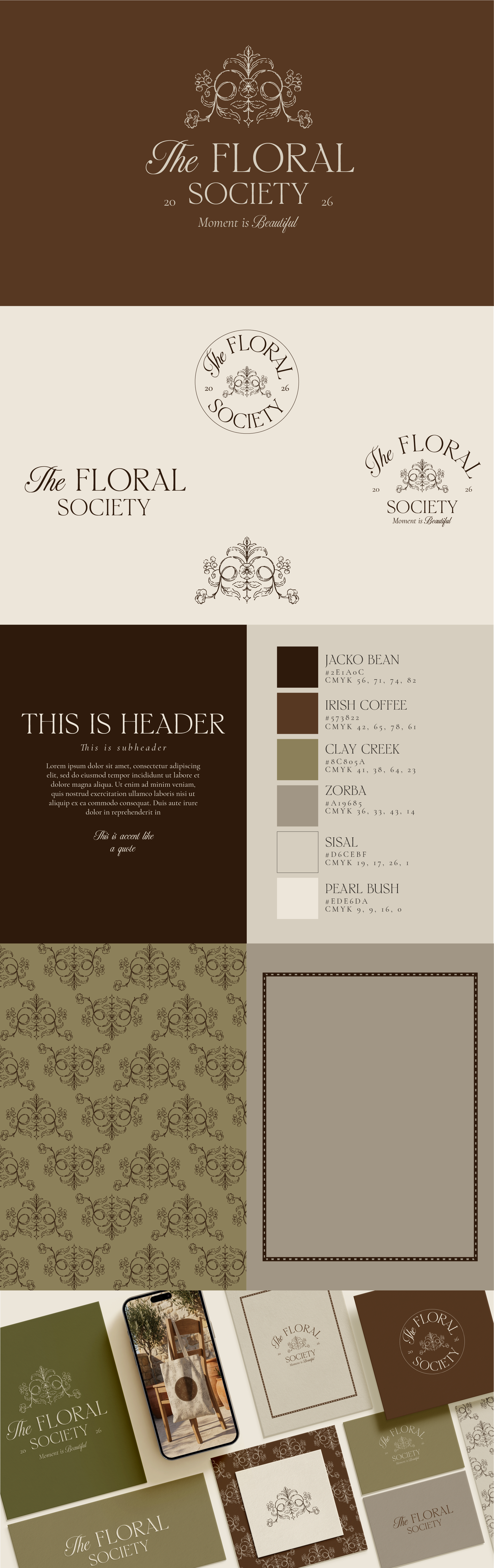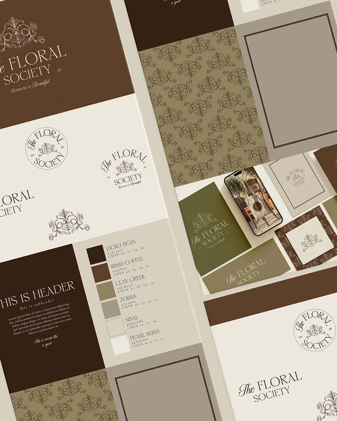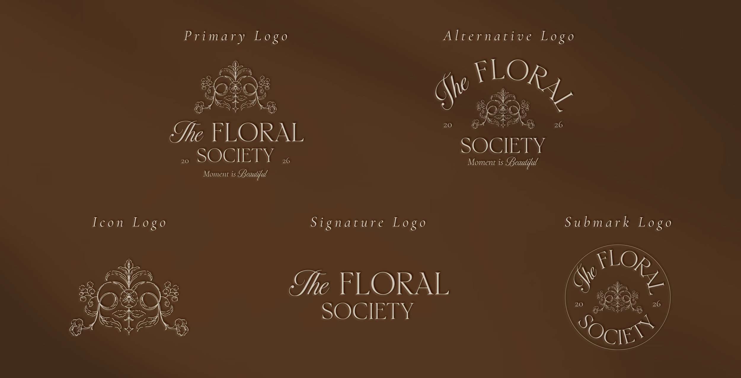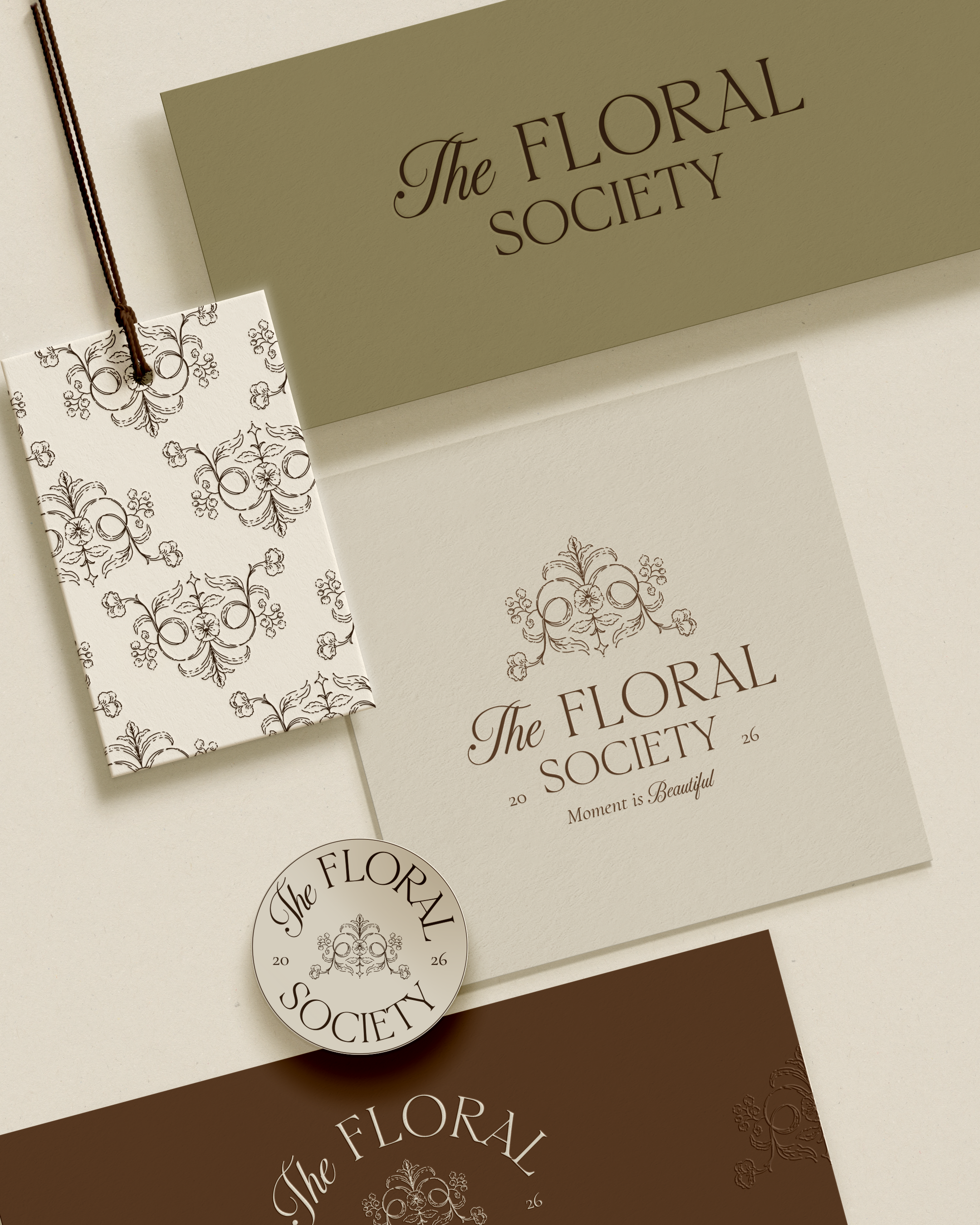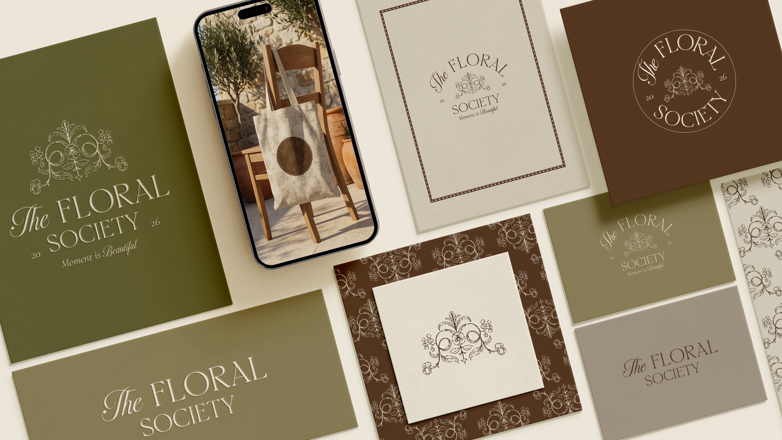 Its visual identity blends warm earthy browns, soft botanical greens, and delicate ivory tones, creating a palette that feels both natural and sophisticated. Ornamental floral crests, refined botanical patterns, and classic circular seals form the foundation of the aesthetic, evoking the feeling of an exclusive society dedicated to flowers, beauty, and thoughtful living.