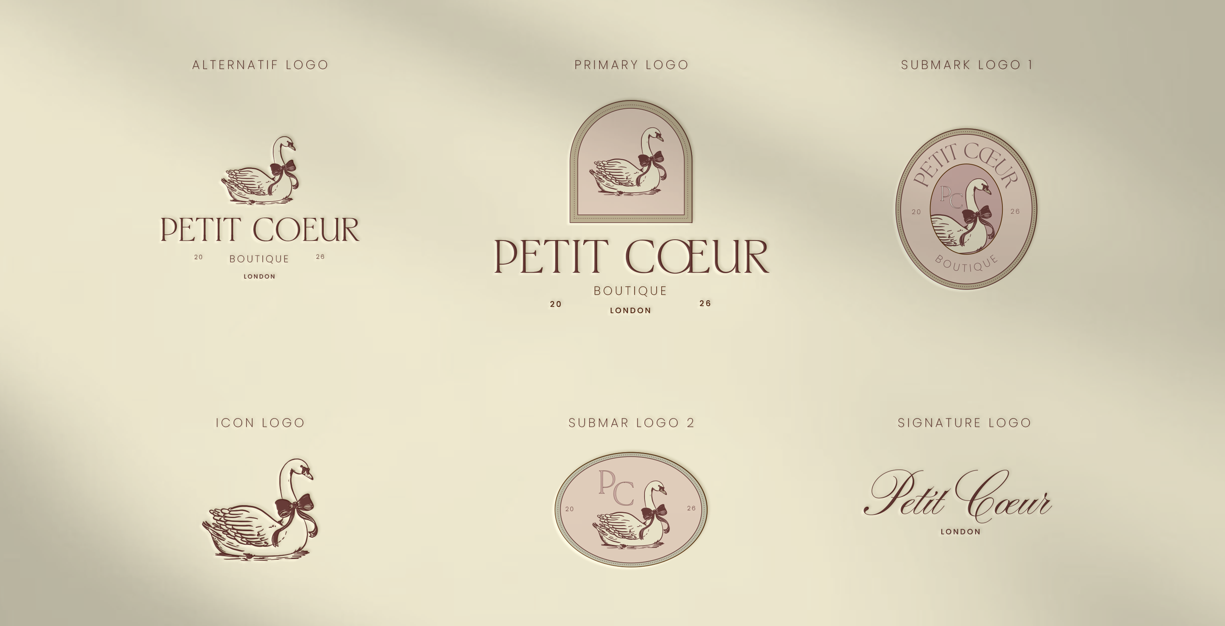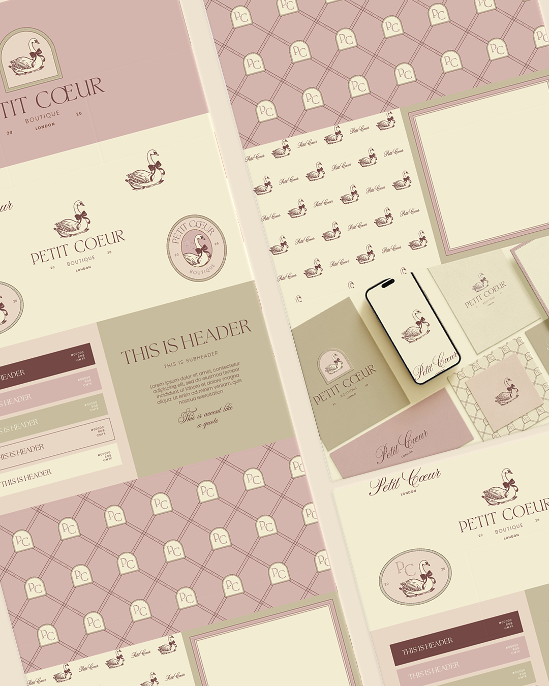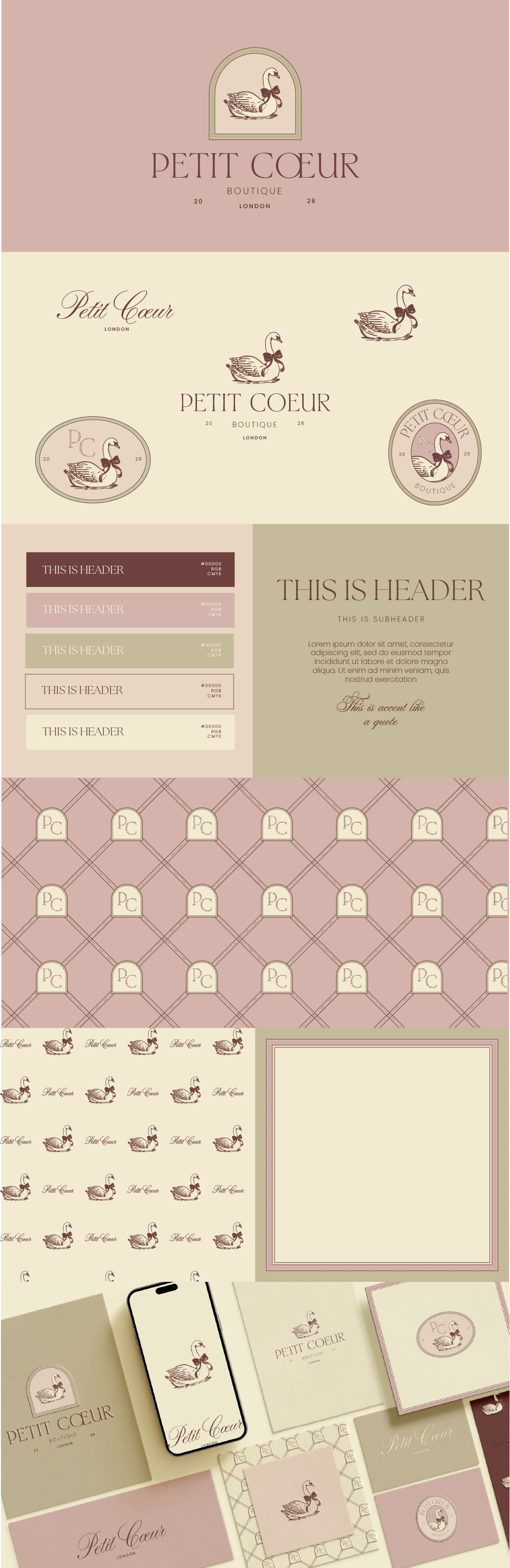 Its visual identity is built around powder pinks, warm ivory tones, and subtle muted neutrals, creating a palette that feels both gentle and sophisticated. Signature elements such as the graceful swan, romantic emblems, refined frames, and delicate repeating patterns form the foundation of the aesthetic, evoking a world where softness meets quiet luxury.