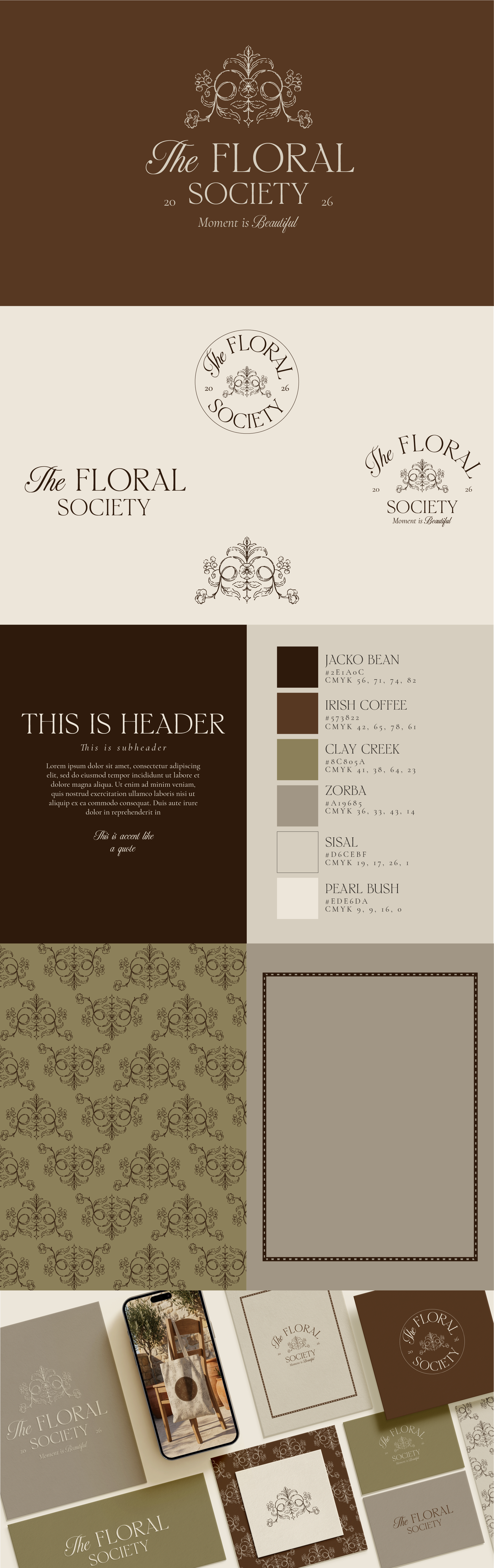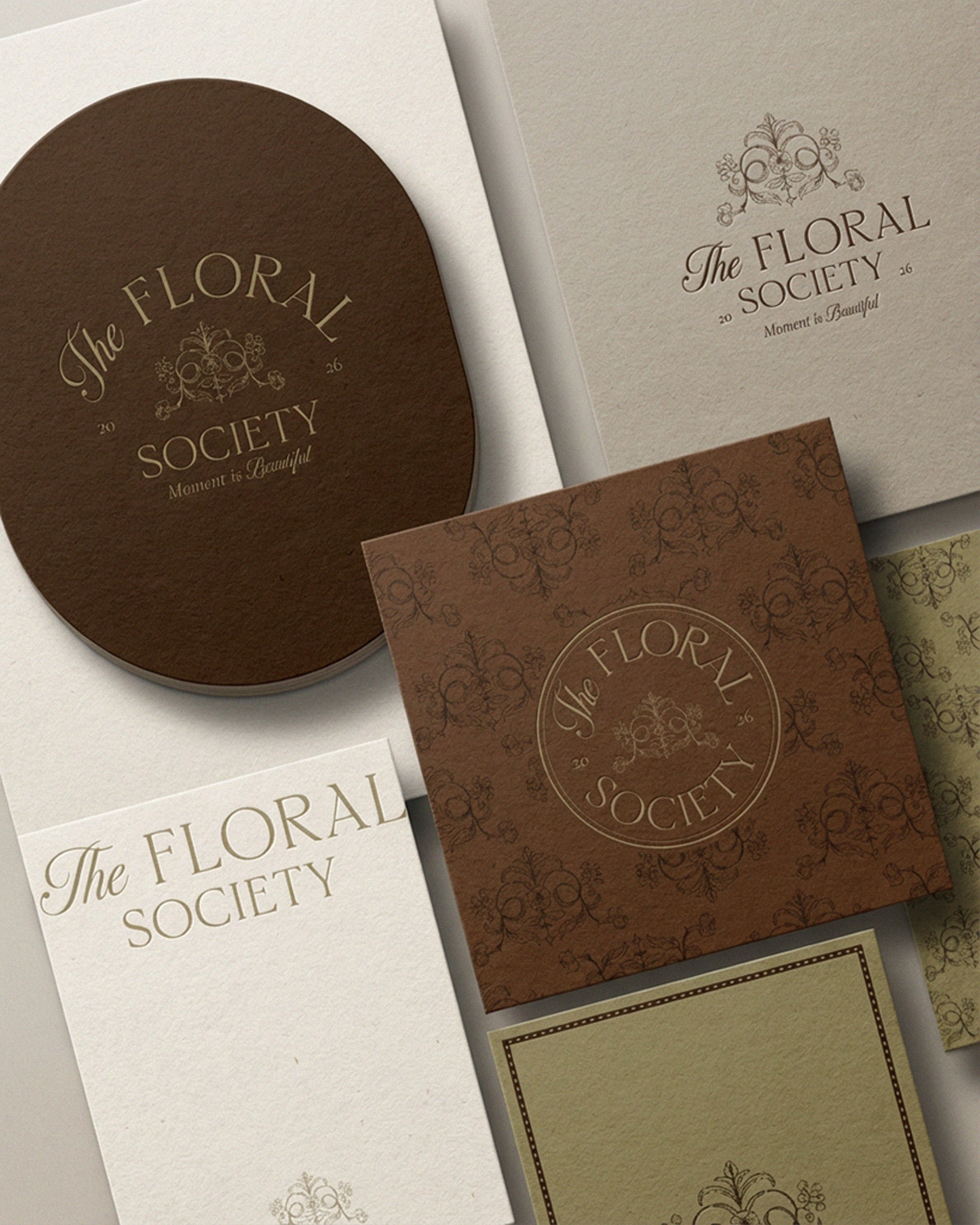 Its visual identity blends warm earthy browns, soft botanical greens, and delicate ivory tones, creating a palette that feels both natural and sophisticated. Ornamental floral crests, refined botanical patterns, and classic circular seals form the foundation of the aesthetic, evoking the feeling of an exclusive society dedicated to flowers, beauty, and thoughtful living.